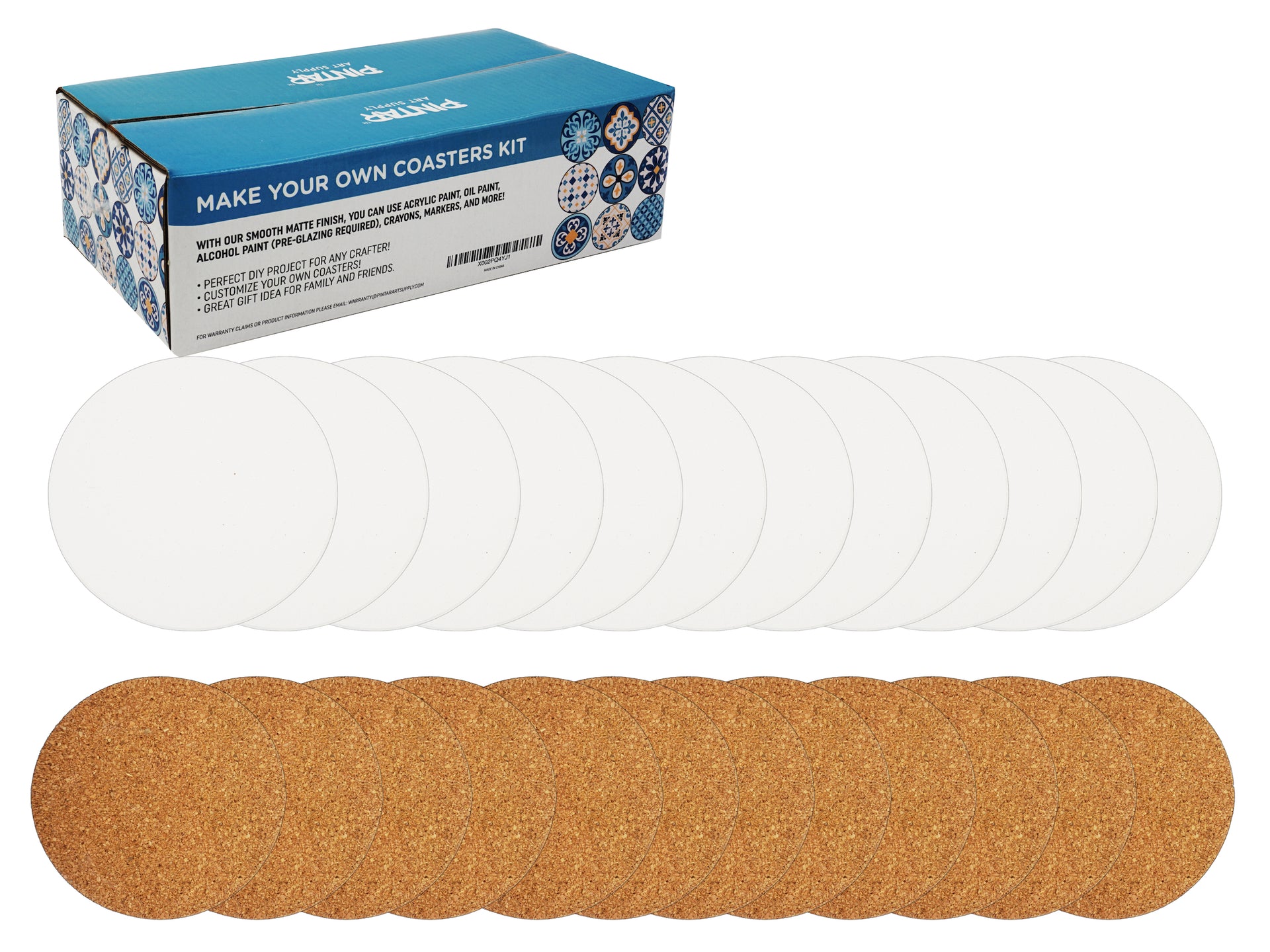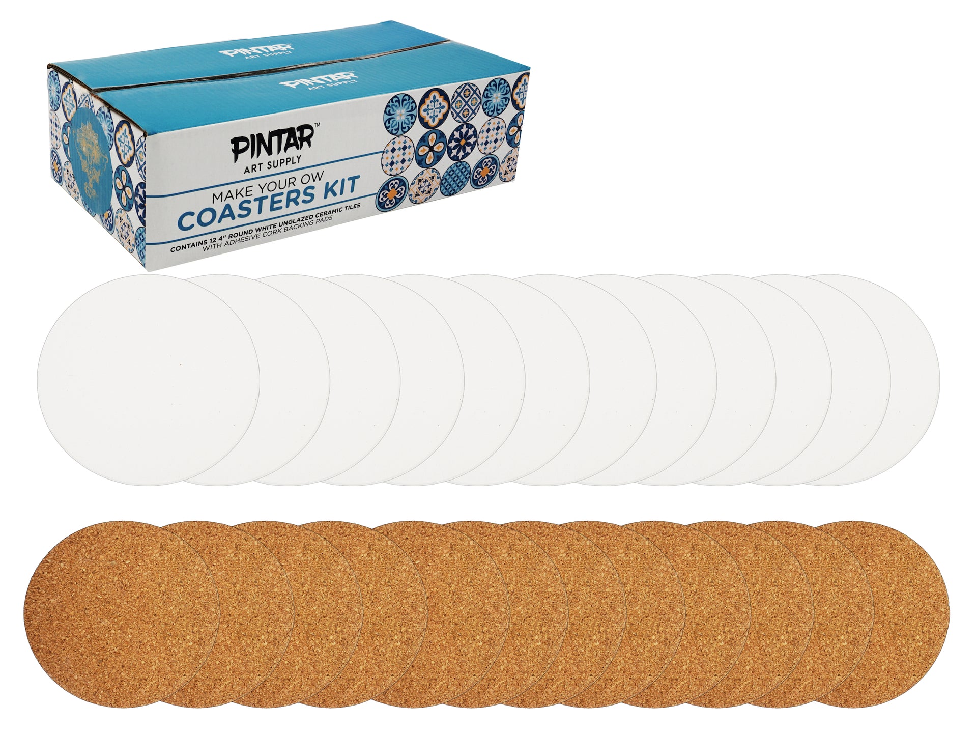 Pintar Make Your Own Coasters Kit12 Pack of 4” Round White Unglazed Ceramic Tiles with Adhesive Cork Backing Pads Use with Alcohol Ink, Acrylic Paints