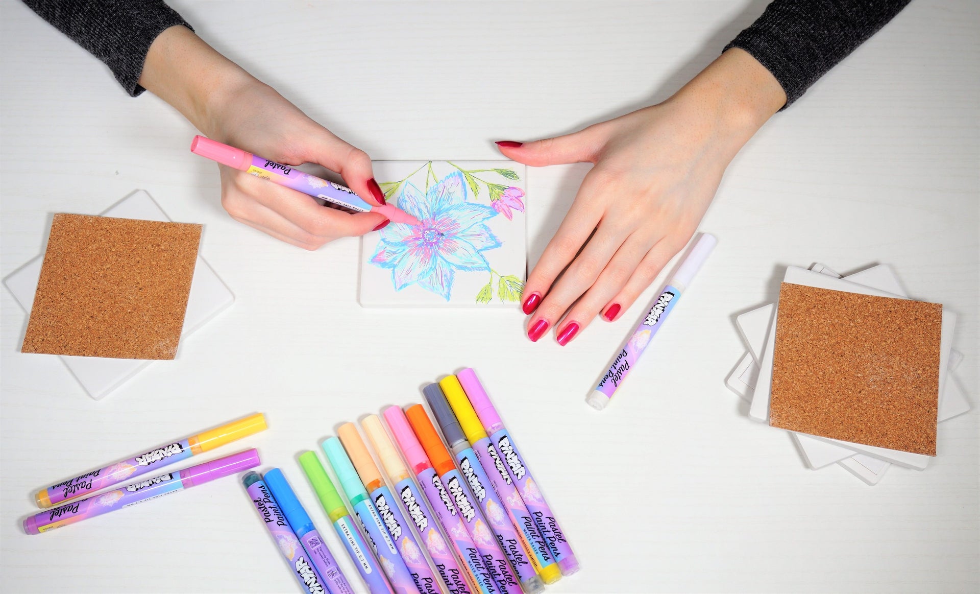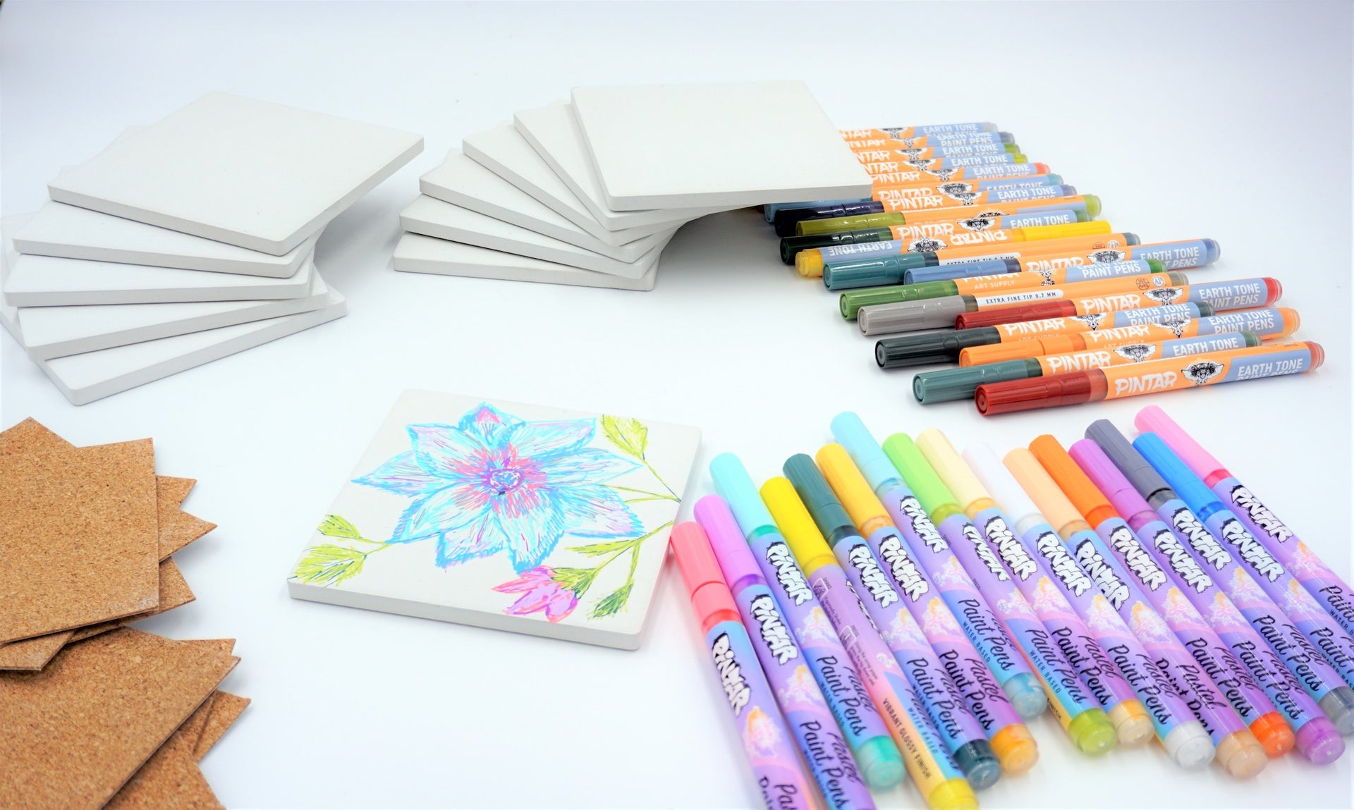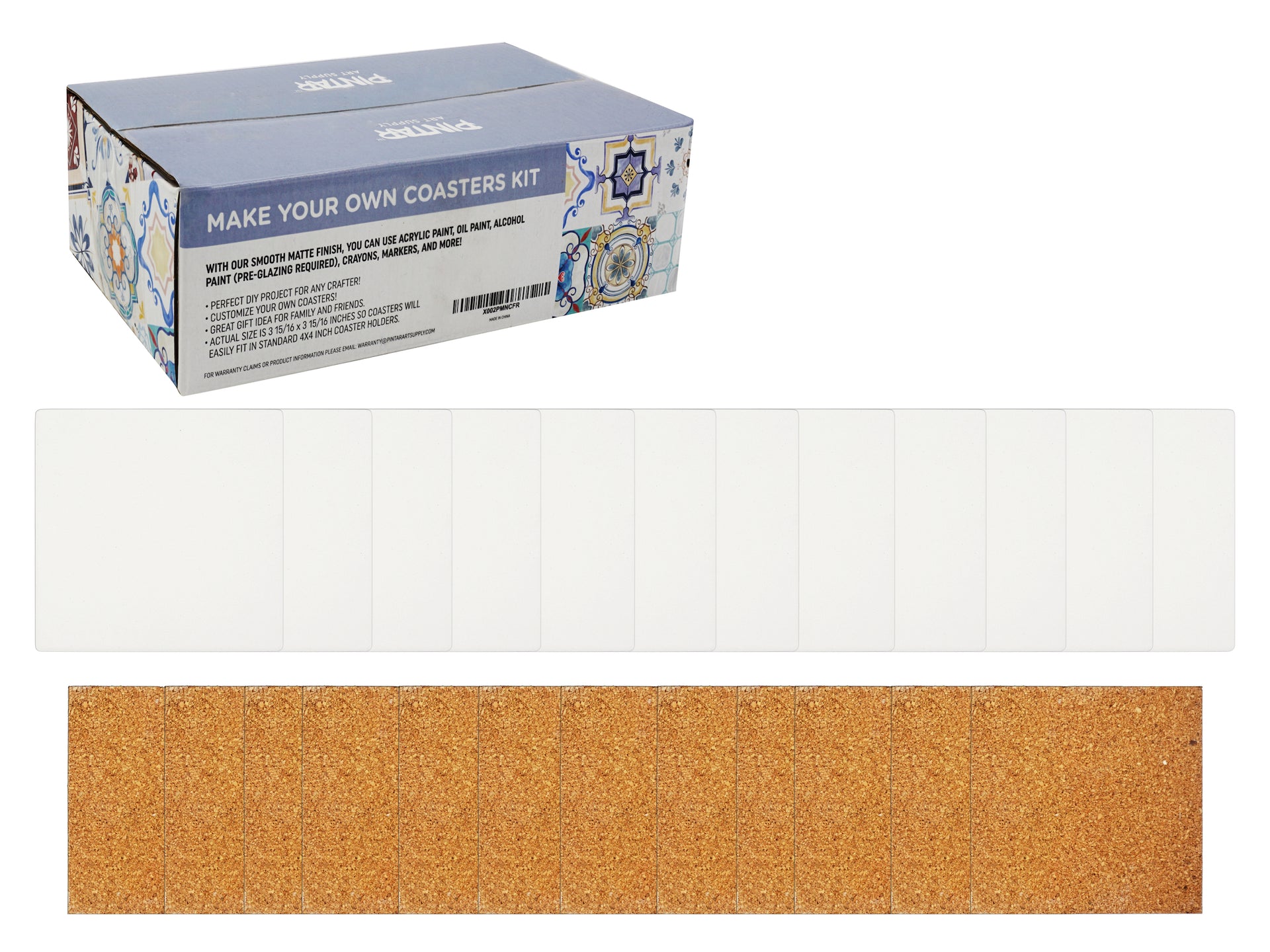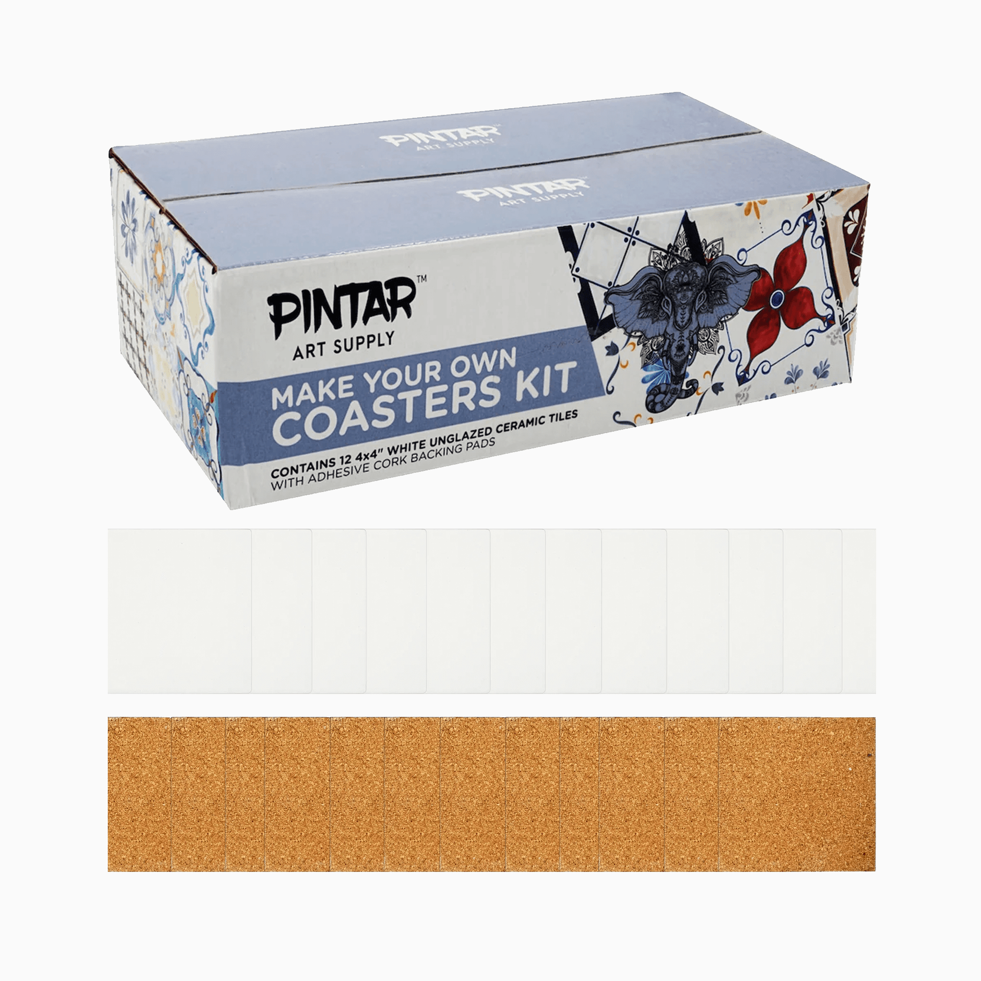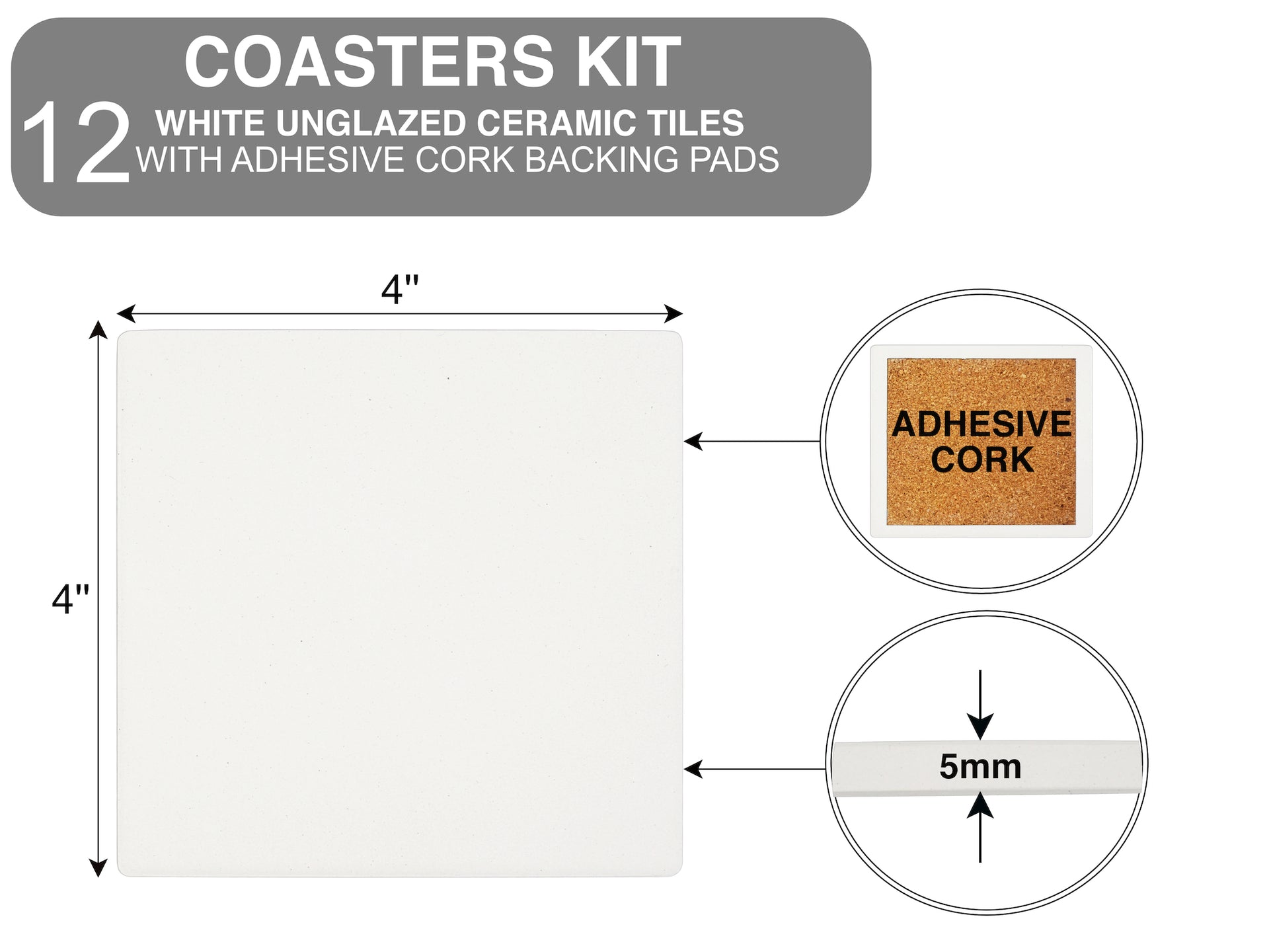 Pintar Make Your Own Coasters Kit | 12 Pack of 4x4” White Unglazed Ceramic Tiles with Adhesive Cork Backing Pads, Use with Alcohol Ink, Acrylic Paints